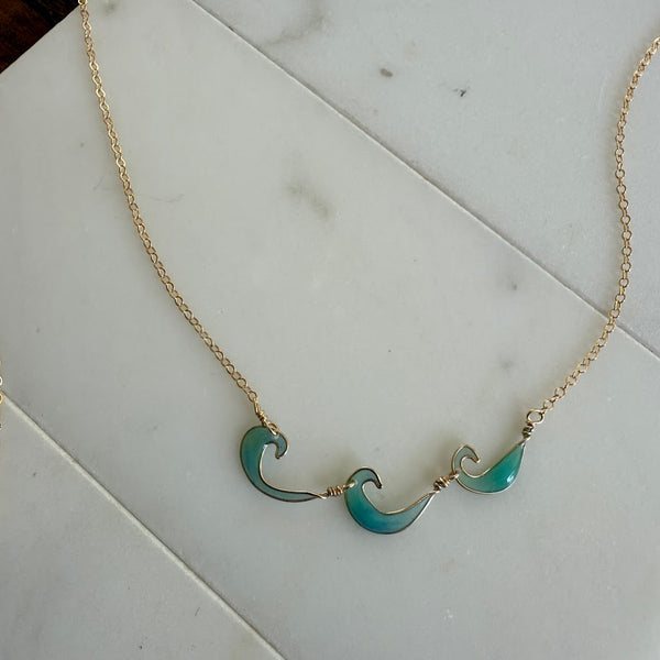 Prepare to make a splash with our Colored 3 Waves Necklace! Each wave has been carefully crafted to have its own unique shape and color, making it the perfect accessory for showing off your mermaid obsession. This piece is both a wire sculpture and a tiny painting. And just like the sea, no two are exactly alike!