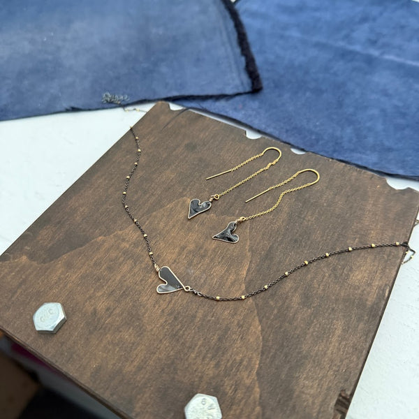 Weightless black heart necklace has such an impact when you wear it! This sideways heart necklace will be your new favorite for layering or on it's own. This little necklace features a tiny wire heart on a unique black oxidized sterling silver chain with silver or gold sparkly accents